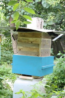 | 1.07.2010 перегнал семью в такую конструкцию. Нижний голубой утепленный каркасный корпус, сверху корпус из 20 мм доски, сверху кормушка. За 10 дней отстроили в верхнем корпусе почти 4 языка из 7. Каждый день подкармливаю по 200 мл сиропа 1:1,5. Кто что скажет как подкармливать дальше: так же по 200 мл или поднять дозу до 500? Взятка практически нет.