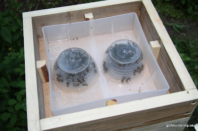 | В первый варик сажал свой рой 1.3 кг после выдержки его до вечера в погребе. Пчёл просто высыпал в верхний корпус. Утром все пчёлы вернулись в материнскую семью. Второй рой был около 1 кг, но матку я в нём не нашел. Тогда я положил на верхний корпус клетку с другой маткой, а пчёл высыпал на трап. Когда они зашли и стали кормить матку в клеточке, вынул её и запустил через леток. Сверху поставил малую курскую кормушку и налил 0.5 л сиропа. Леток, на всякий случай, закрыл решеткой, пока пчёлы не начали работать. Остальные три варика заселял через леток с решеткой, стряхивая пчёл с рамок и из кошей на трап. Маток каждый раз отлавливал и запускал в улей отдельно: через леток, через верх в клеточке и через верх без клеточки. Не подкармливал, поскольку КУ уже показывал +. Проблем не возникло.